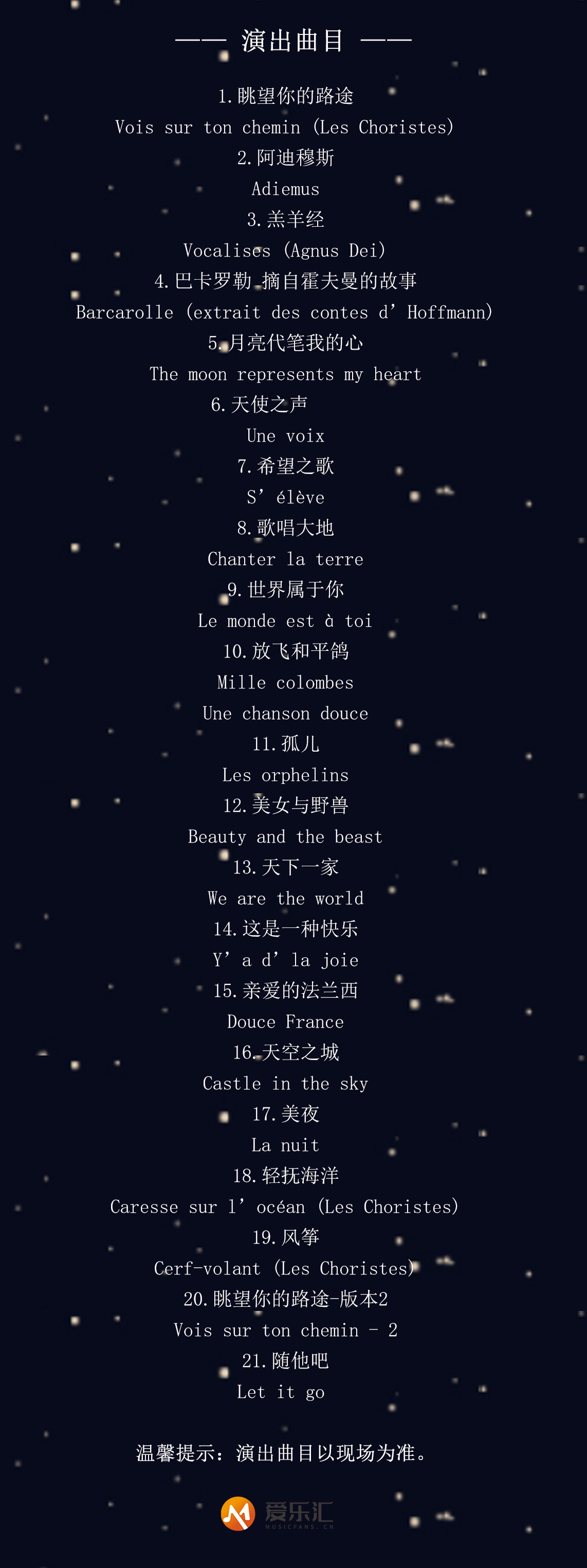 - 演出信息詳情僅供參考(kao),具體以主(zhu)辦方及現場(chang)公布為(wei)準(zhun),請準(zhun)時入場(chang)以免耽(dan)誤觀演。